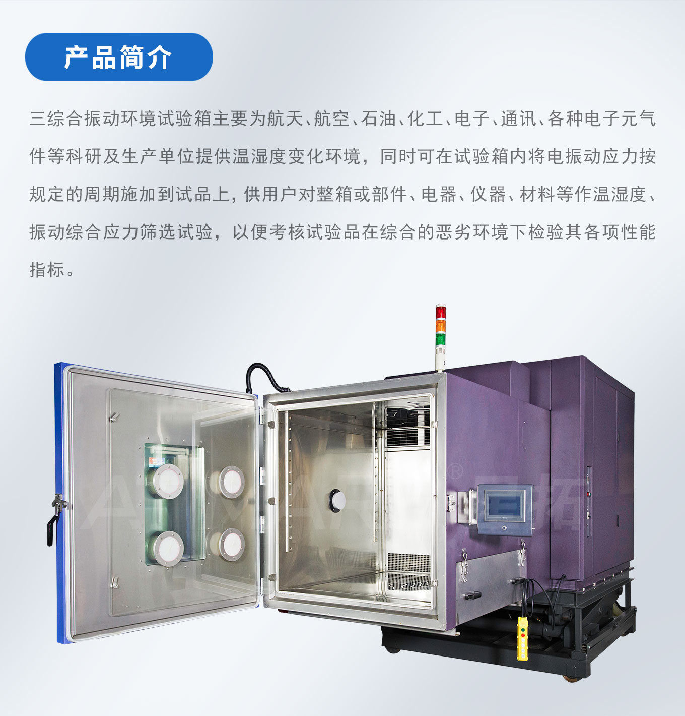 三综合振动环境探花在线观看主要为航天、航空、石油、化工、电子、通讯、各种电子元气件等科研及生产单位提供温湿度变化环境,同时可在探花在线观看内将电振动应力按规定的周期施加到试品上,供用户对整箱或部件、电器、仪器、材料等作温湿度、振动综合应力筛选试验,以便考核试验品在综合的恶劣环境下检验其各项性能指标。